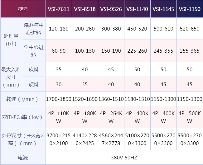 vsi沖擊式制砂機(jī)有好多種不一樣的規(guī)格型號(hào),而每種型號(hào)的打沙機(jī)搭配的電動(dòng)機(jī)、機(jī)械的轉(zhuǎn)速、所能解決的物料的粒度范圍和機(jī)械的總重量等是不一樣的,技術(shù)參數(shù)是用戶選購(gòu)機(jī)械時(shí)的重要參數(shù)資料,關(guān)于vsi沖擊式制砂機(jī)的詳細(xì)參數(shù)請(qǐng)看下文技術(shù)參數(shù)表。