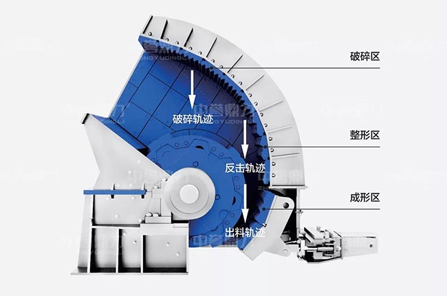 3、采用液壓活動襯板控制出料大小,不會堵料,粗、中、細碎一步到位,成品率高,粒形好。