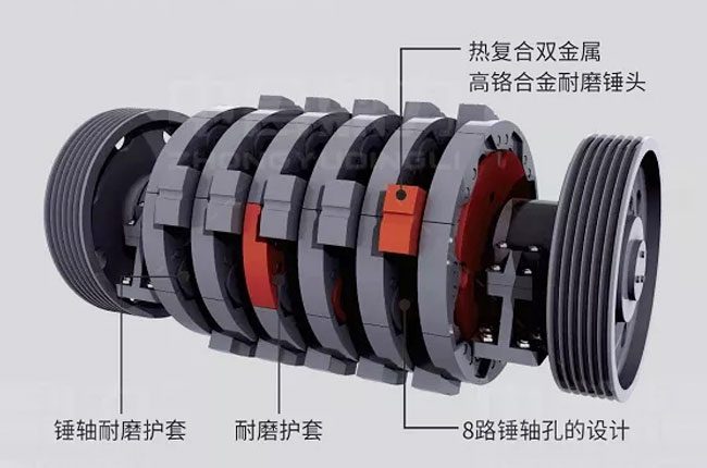當物料進入破碎腔后,電機帶動轉子旋轉,轉子帶動錘頭將物料打到反擊板上進行破碎,過后在進行反拋進行再次破碎,重復以上過程,物料會由大到小,等破碎到合適粒度,就會從排料口出來,而且出料粒度可以根據自己的要求調整大小。