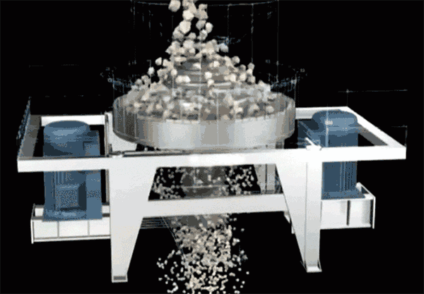 加工原料由給料斗進入打砂機,經分料器將加工原料分成兩部分,一部分由分料器中間進入高速操作的葉輪中,在葉輪內被快速加速,其加速度可達數百倍重力加速度,然后以60-70米/秒的速度從葉輪三個均布的流道內拋射出去,先同由分料器四周自收落下的一部分加工原料沖擊破碎,然后一起沖擊到渦支腔內加工原料襯層上,被加工原料襯層反彈,斜向上沖擊到渦動腔的頂部,又改換其運動方向,偏轉向下運動,從葉輪流道發射出來的加工原料形成持續的加工原料幕,這樣一塊加工原料在渦動機腔內獲得兩次以至多次機率抨擊、磨擦和碾磨破碎影響,被破碎的加工原料由底部出料口排出,在整下破碎過程當中,加工原料相互自行沖擊破碎,不與金屬元件直接接觸,而是與加工原料襯層出現沖擊、摩擦而粉碎,這就縮小了角污染,增長機器磨損時間,渦動腔內部巧妙的氣流自循環,解決了揚塵污染。
