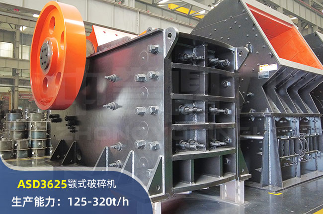 ASD3625顎式破碎機(jī)進(jìn)料口尺寸910×630mm,進(jìn)料粒度≤425mm,出料大小≤50mm,電機(jī)功率90kw,時(shí)產(chǎn)320噸左右。