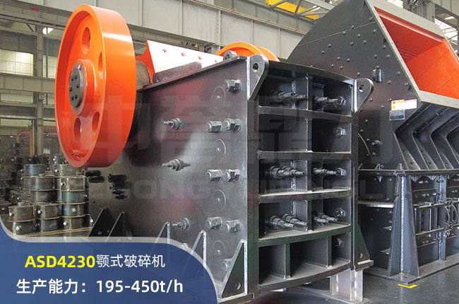 ASD4230顎式破碎機進料粒度500mm左右,出料可達65mm,時產量195-450噸。