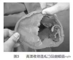 高溫煙氣對濾袋的另外一種損害是高溫收縮,雖然每種濾料的使用溫度不同,但當煙氣溫度過其使用溫度后,如其經向收縮率過大,會使濾袋在長度方向上尺寸變短,濾袋袋底緊托著骨架并受力而損壞(如圖3)。如果濾袋緯向熱收縮過大,將使濾袋在徑向尺寸變小,濾袋會緊緊箍在骨架上,甚至無法抽出骨架。從而使濾袋處于受力狀態,造成濾袋的收縮變形、變硬、變脆,加快強度耗損、減短濾袋壽命。由于濾袋變形后會緊緊箍在骨架上,在清灰時濾袋難以變形而不利于噴吹清灰,導致濾袋阻力居高不下。