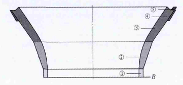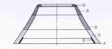 (1)模樣制作工藝CH660單缸圓錐破碎機(jī)動(dòng)錐、定錐襯板采用消失模分部制作粘合整體手工修正模樣制作完成。須工序合理,定位選擇準(zhǔn)確,模樣垂直度和同軸度要求。動(dòng)錐襯板:按圖1所示工藝制作模樣,在圓周方向六等分,高度方向分5部分進(jìn)行樣板放樣,分部制作模樣;以A 面為基準(zhǔn),逐步粘合①~⑤部分,校準(zhǔn)各部分模樣同軸度;按工藝圖要求進(jìn)行整體手工修整,模樣準(zhǔn)確與完整。定錐襯板:按圖2所示工藝制作模樣,在圓周方向六等分,高度方向分三部分進(jìn)行樣板放樣,制作模樣;以B 面及內(nèi)外徑為基準(zhǔn),先對(duì)①、②、③主體部分粘合校正,再粘合法蘭④,整體校正后,后分度粘合12個(gè)定位銷(xiāo)⑤。按工藝圖要求進(jìn)行整體手工修模。