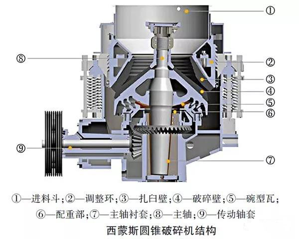 關鍵有機架、水準軸、動錐體、均衡輪、偏心套、上粉碎壁(不變錐)、下粉碎壁(動錐)、液力偶合器、潤滑體系、液壓體系。