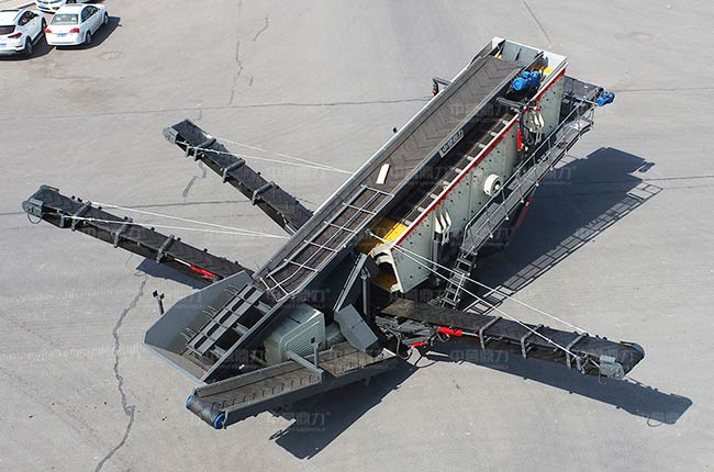 輪胎移動(dòng)篩分機(jī)工作時(shí),上料皮帶機(jī)將原料送至篩分機(jī)頂部,通過振動(dòng)篩篩選作業(yè),頭層篩網(wǎng)大顆粒骨料會(huì)通過返料皮帶機(jī)返回上級(jí)破碎機(jī),其他層級(jí)篩網(wǎng)篩出的物料從篩機(jī)兩側(cè)可用移動(dòng)皮帶機(jī)輸送。