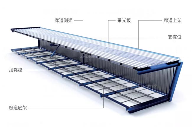中譽鼎力DL組裝式廊道(砂石運輸廊道),組成部分包括廊道底架、加強撐、波紋側(cè)板、底部花紋板、廊道側(cè)梁、采光板、廊道上架、支撐位等組成。廊道內(nèi)還設(shè)置有電纜、照明裝置、監(jiān)控攝像頭固定位置。