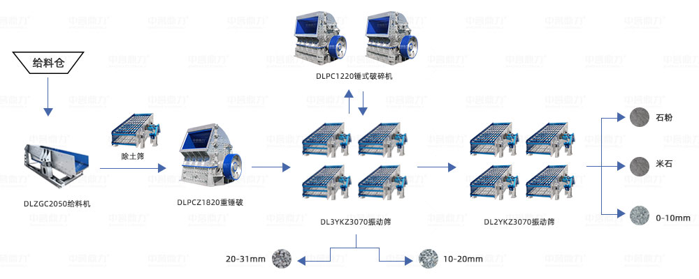 時產(chǎn)1000噸碎石干法生產(chǎn)線,“干法”沒有水洗工藝,比較常見的有以下3種配置工藝方案: