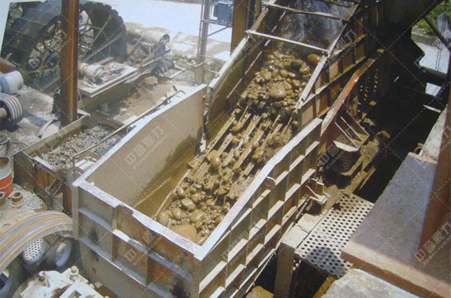 加工原料經振動送料機定期、定向將加工原料送入pe鄂破機進行粗碎,送料的此時,預先篩選分級出加工原料中夾雜的異物,防止其進入碎石機的機腔,毀壞機器,從pe鄂破機出來后,振動篩篩選出破碎合格的部分送入二級破石機械(反擊礦山碎石機、圓錐碎石機)進行二段破碎,破碎至更小的顆粒,便于進行制砂處置,石子打砂機對二段破碎合格的加工原料進行沖擊制砂,根據成品要求,將性能調改至滿意數據,生產出期望粒度的成品砂石,加工原料從石子打砂機出來,會攜帶有揚塵,砂石洗選機械可以將包覆在砂石表面的揚塵,和中間夾雜的異物清洗干凈,后獲得干凈的河道石成品砂石。