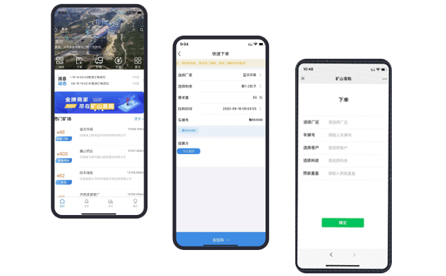 客戶可根據(jù)需求利用礦山易購app、微信小程序等平臺進行自助下單,企業(yè)可根據(jù)散料自動裝車系統(tǒng)可視化交互界面進行訂單查詢、派車、車輛狀態(tài)查詢、報表查詢等。
